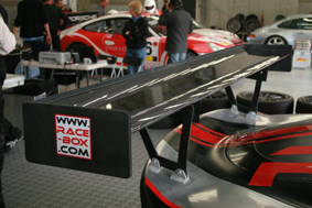 Die gesamte Karosserie besteht aus Carbon Teilen aus eigener Herstellung . Der Heckspoiler ist bis zu 185 cm breit und ebenfalls aus Carbon mit Rohacell Kernmaterial . Das gesamte Fahrzeug wiegt somit nur 780 KG .